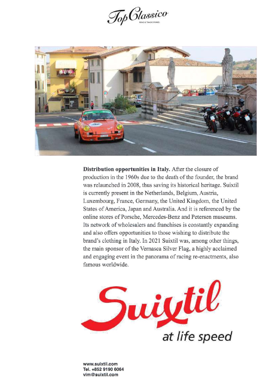 We’re very fortunate again that Laura, from Top Classico, took notice of your brand during the last edition of the Vernasca Silver Flag (we’ve already told you about how great that was…). She, upon her return to base, decided to share the Suixtil story in details with her readers Italian and otherwise. And her story is quite comprehensive – all 14 pages of it. Of course there are many glorious illustrations – you won’t mind a D-type here or a 275GTB there – especially if they are in colors – will you? And Laura was also kind enough to share some of her great shots from some of the fabulous machines she spotted doing their (Suixtil) thing….