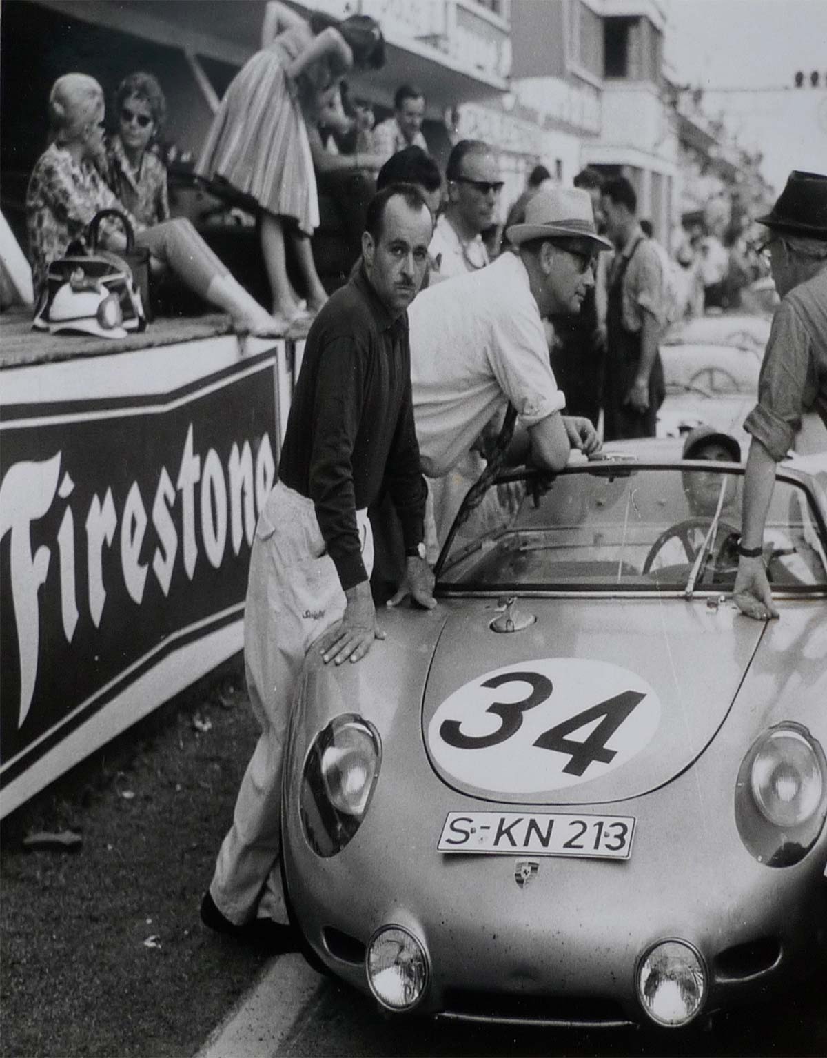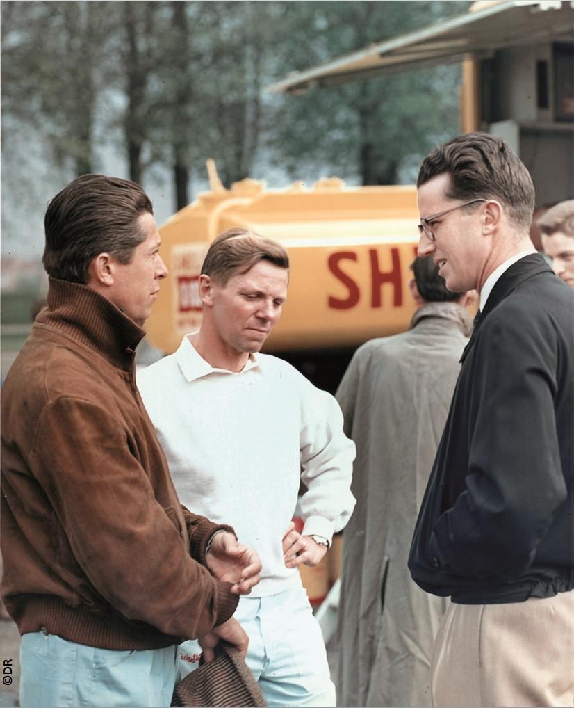 - K Kling, W v. Trips & H v. Hanstein leaning on a Porsche 718, German GP, 1958© Bernhard Völker