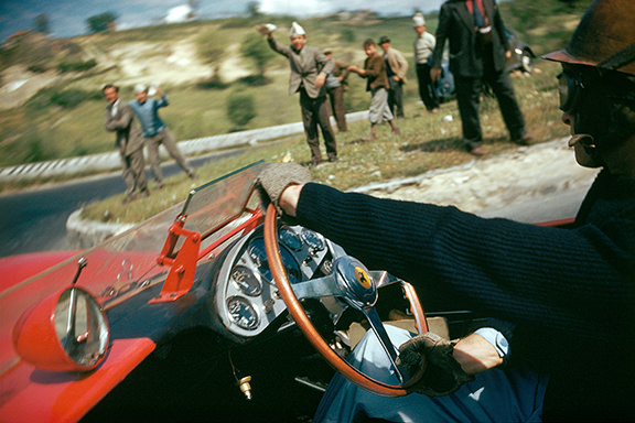 - Peter Collins, in Suixtil, at the start of the ’56 Mille Miglia, with his Ferrari 860 Monza (c)GGolnelli