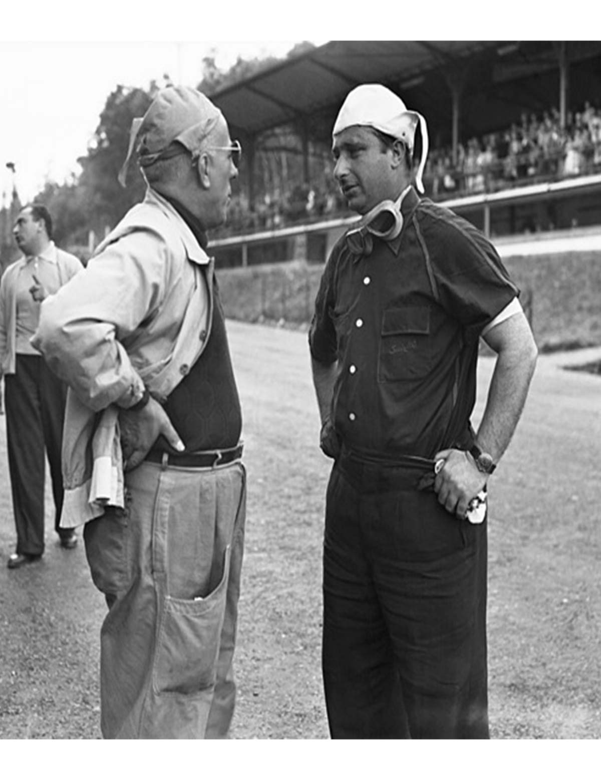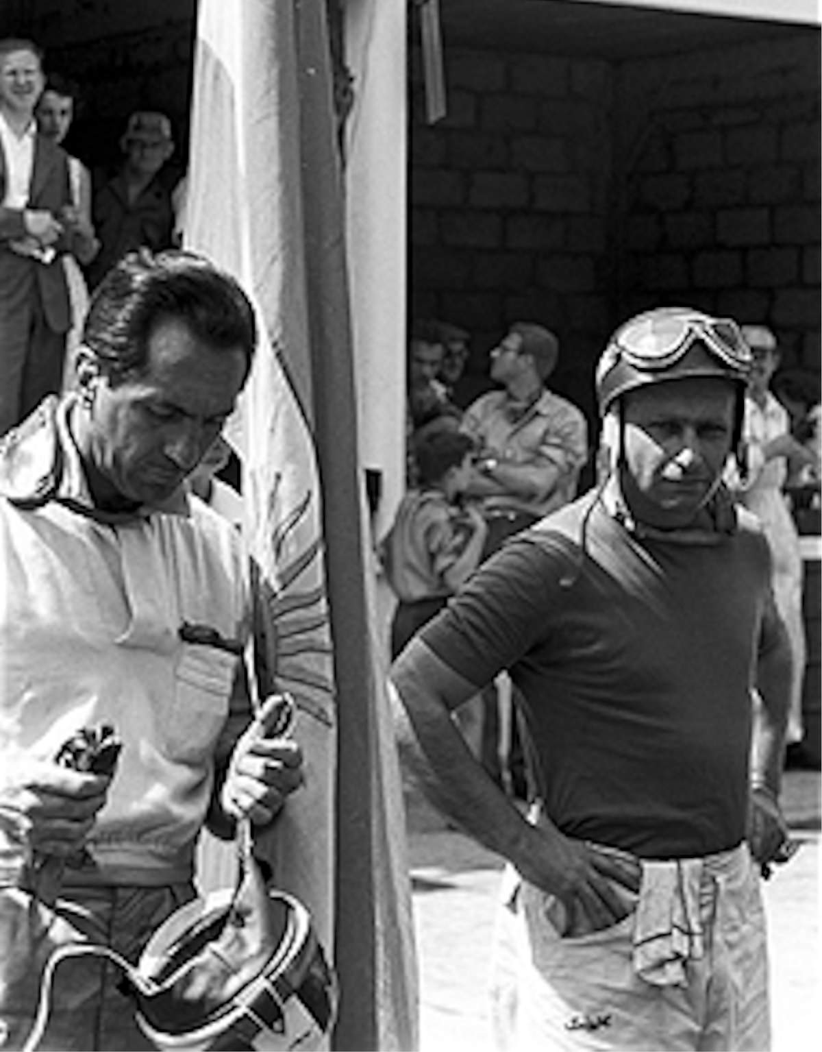 - Peter Collins and Juan Manuel Fangio in the Ferrari pits before the 1956 Belgian Grand Prix in Spa-Francorchamps. Photo: Grand Prix Photo